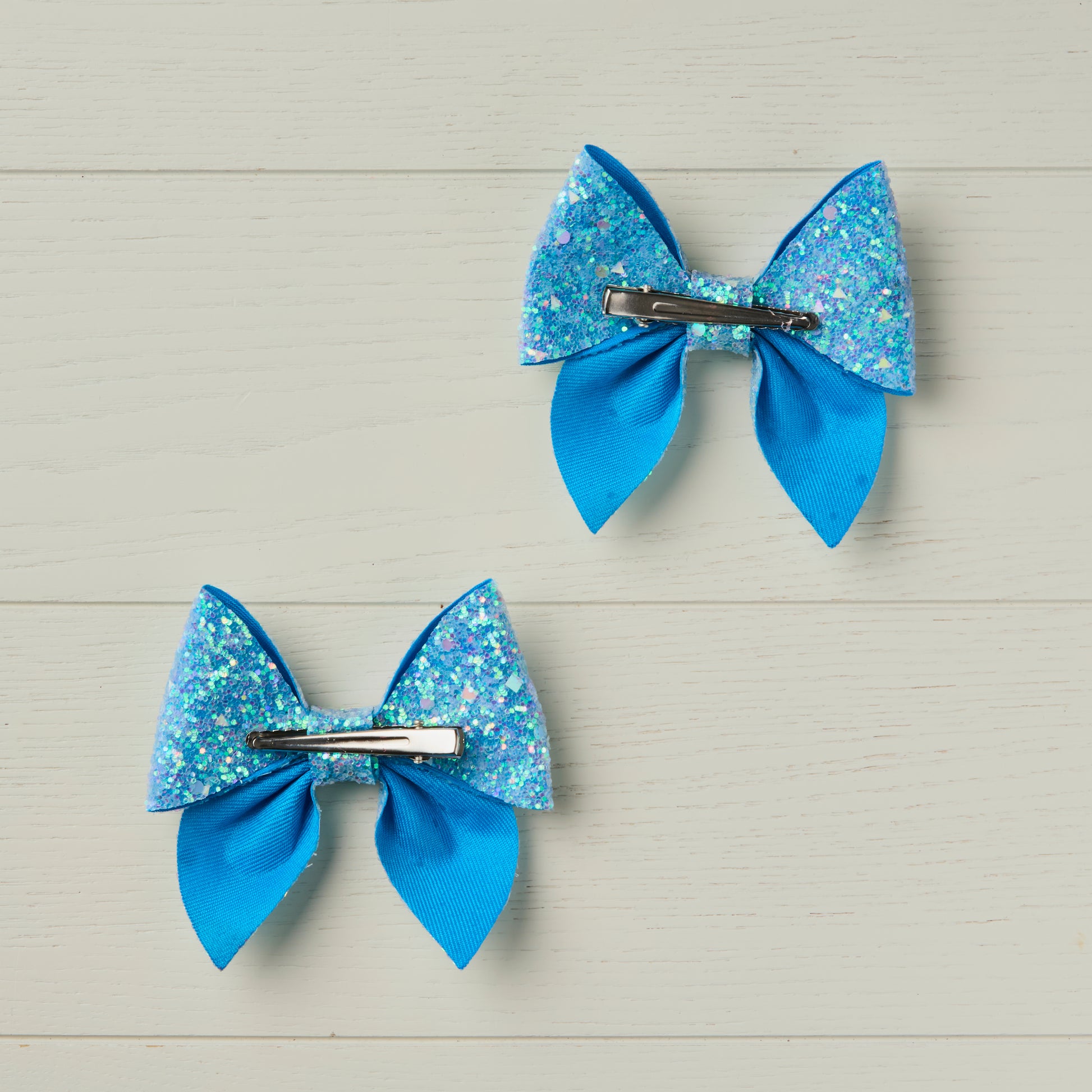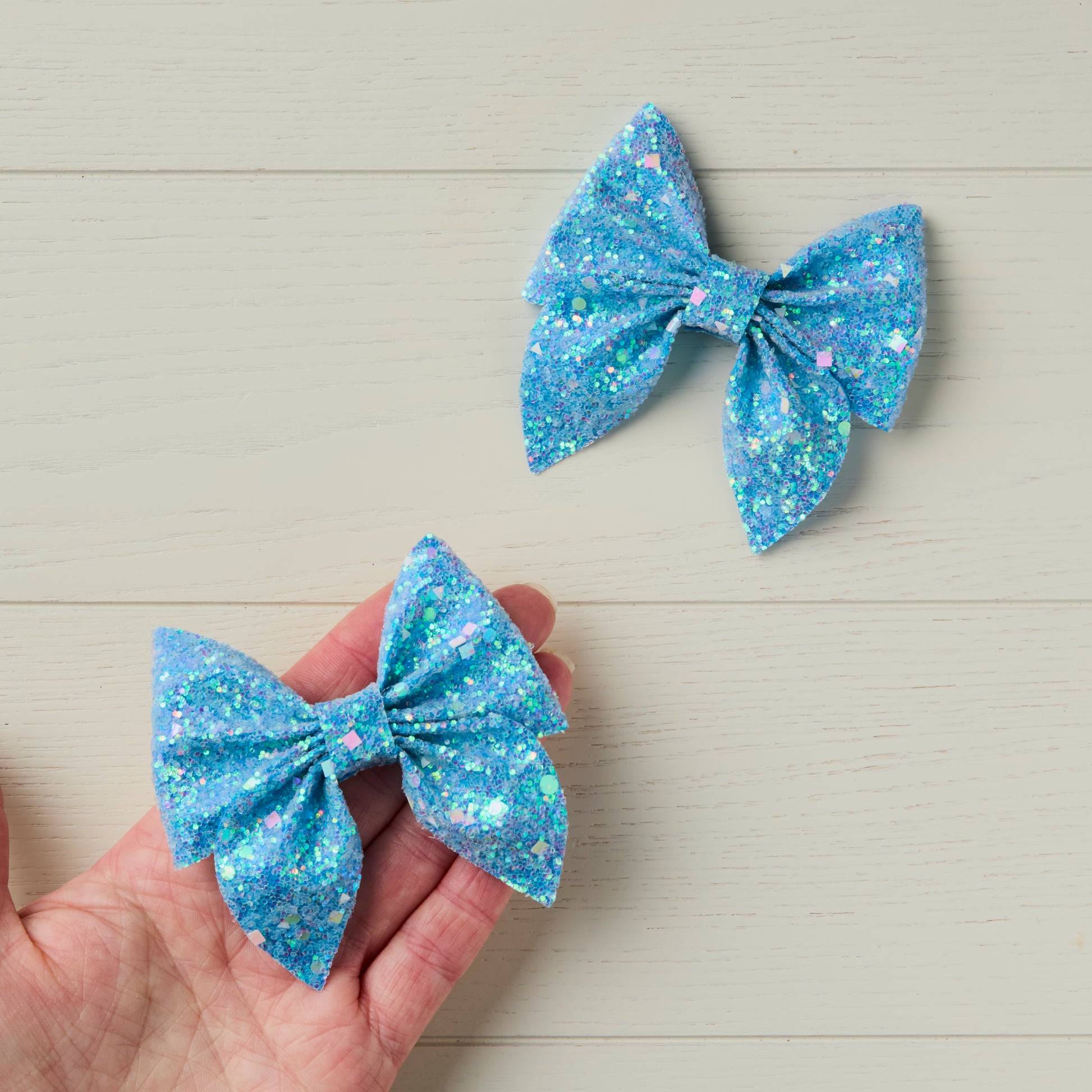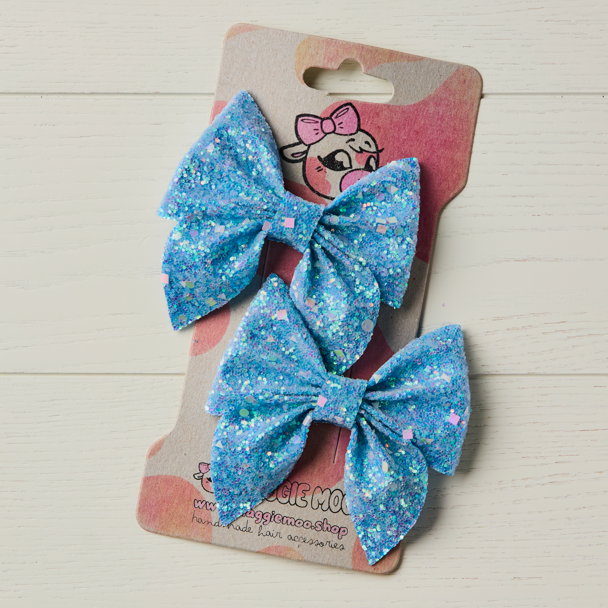 These frosty blue hair bows are handmade with chunky glitter fabric and an extra dose of AB (Aurora Borealis) sparkle, they catch the light with every movement and sparkle in all colours of the rainbow. Perfect for your winter outfits, dress-up parties, or any occasion that calls for a touch of fairy tale magic.