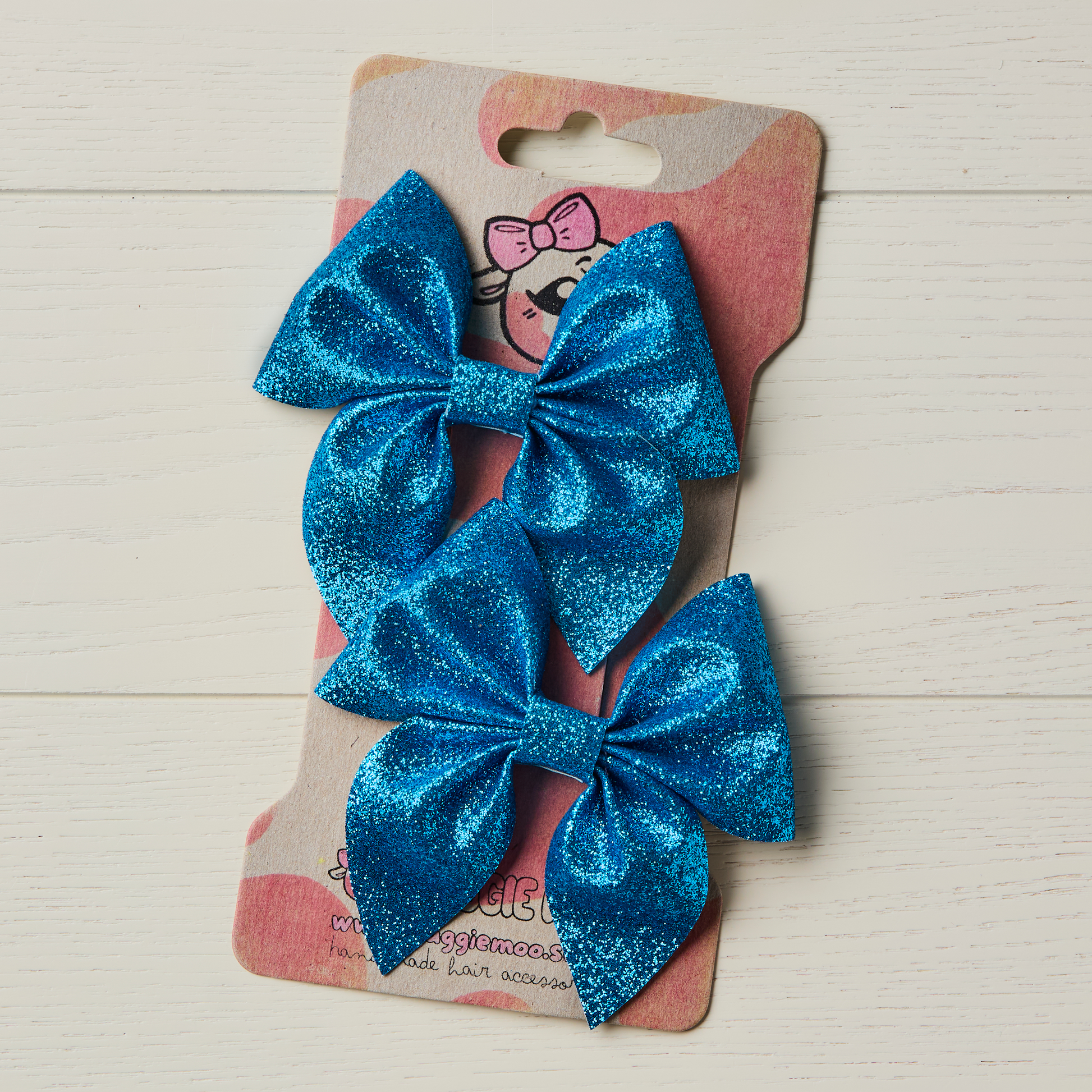 Brighten your day with these stunning kingfisher blue hair bows, handcrafted from fine glitter fabric that shimmers with vivid brilliance. The vibrant shade of blue, reminiscent of a kingfisher's feathers, brings a striking pop of colour to any hairstyle, making these bows a bold and beautiful statement piece. Whether you're accessorising for a celebration or simply want to add a touch of sparkle to your everyday look, these bows are as versatile as they are eye-catching.