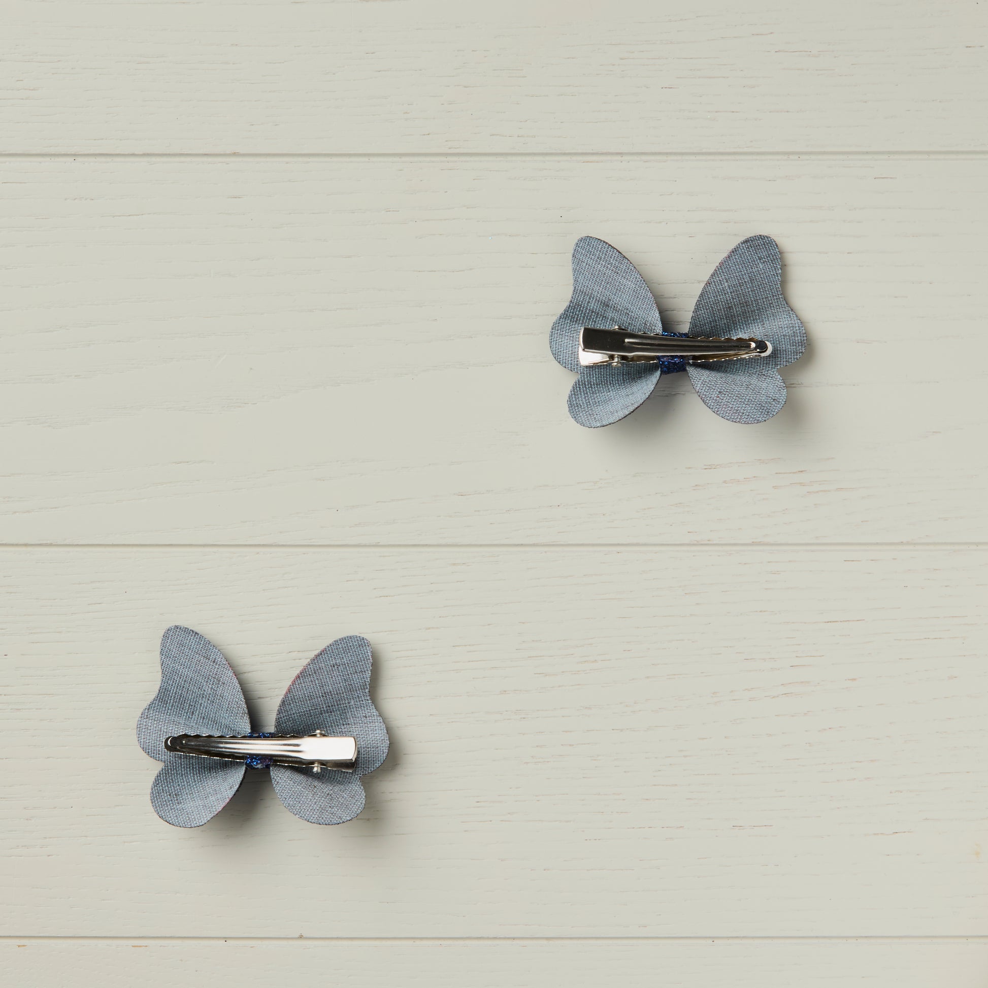 Add a touch of classic charm to any look with these handmade navy blue butterfly hair clips. The delicate shimmer of the fine glitter is perfect for those who appreciate a subtle sparkle. The timeless navy blue pairs effortlessly with school uniforms, everyday outfits as well as formal wear, making them a versatile addition to any hair bow collection.