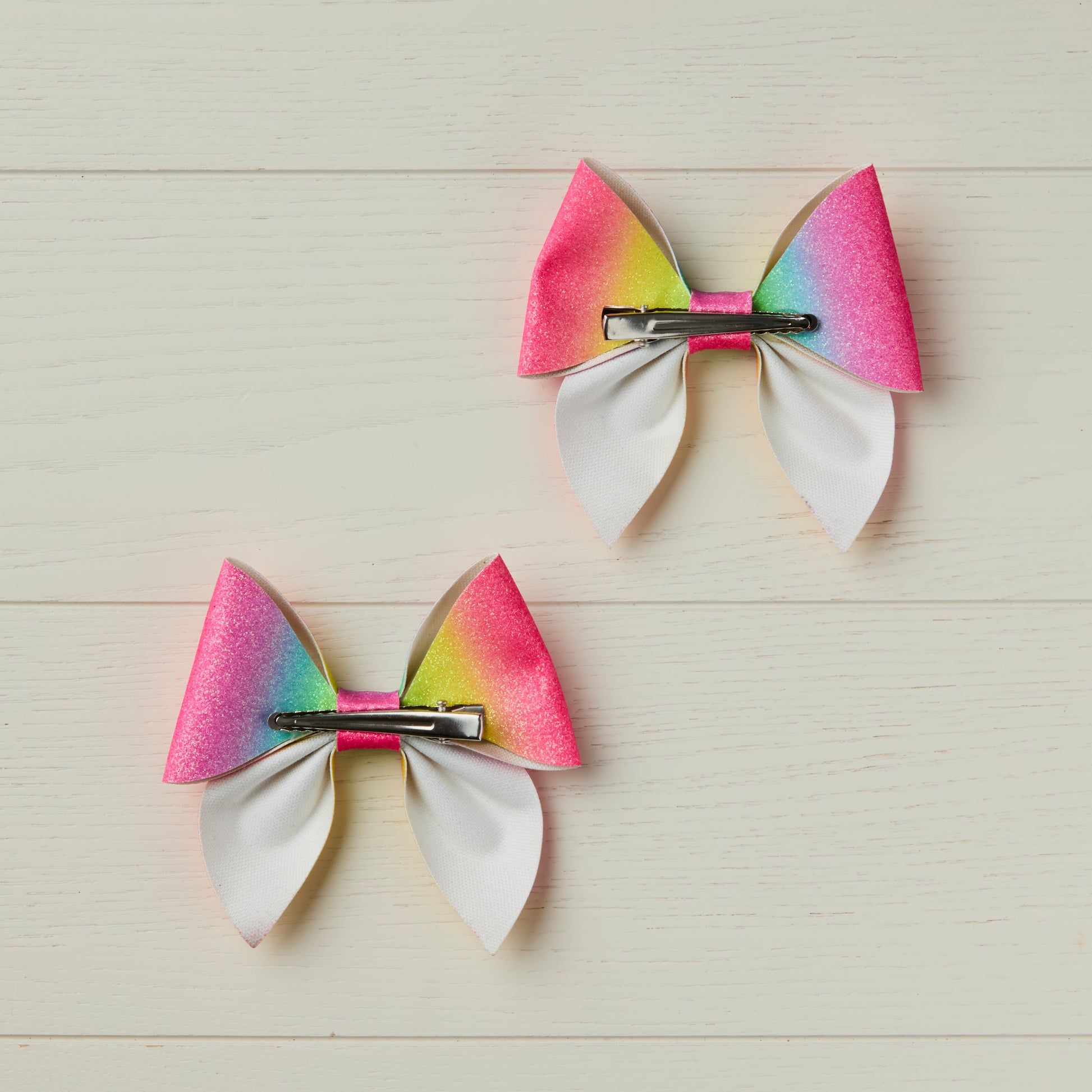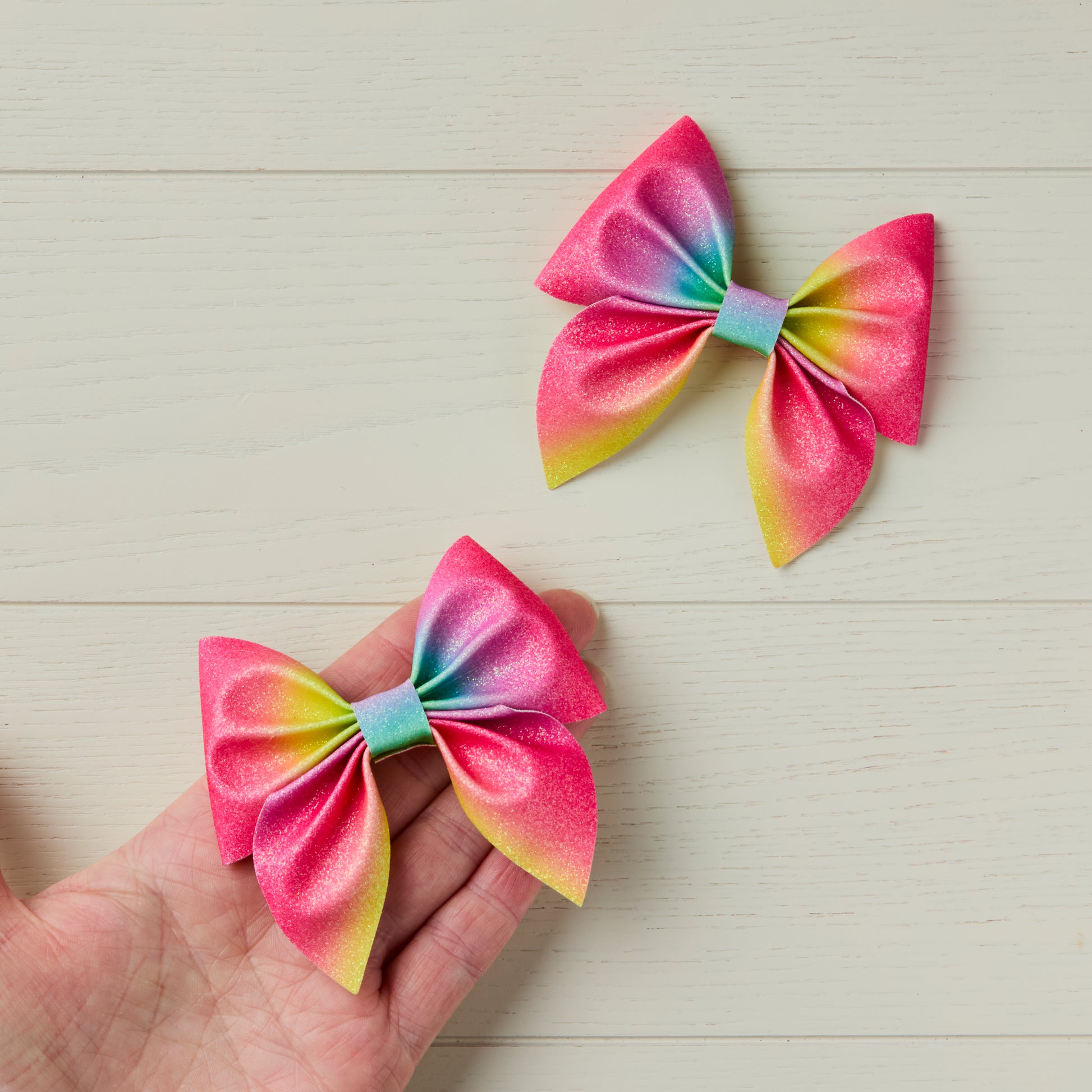 Handcrafted from shimmering fine glitter fabric, these bows glimmer in the bright colours of rainbow. The ombre effect blends vivid hues of pink, purple, blue, green and yellow, making it easy to match with many outfits.