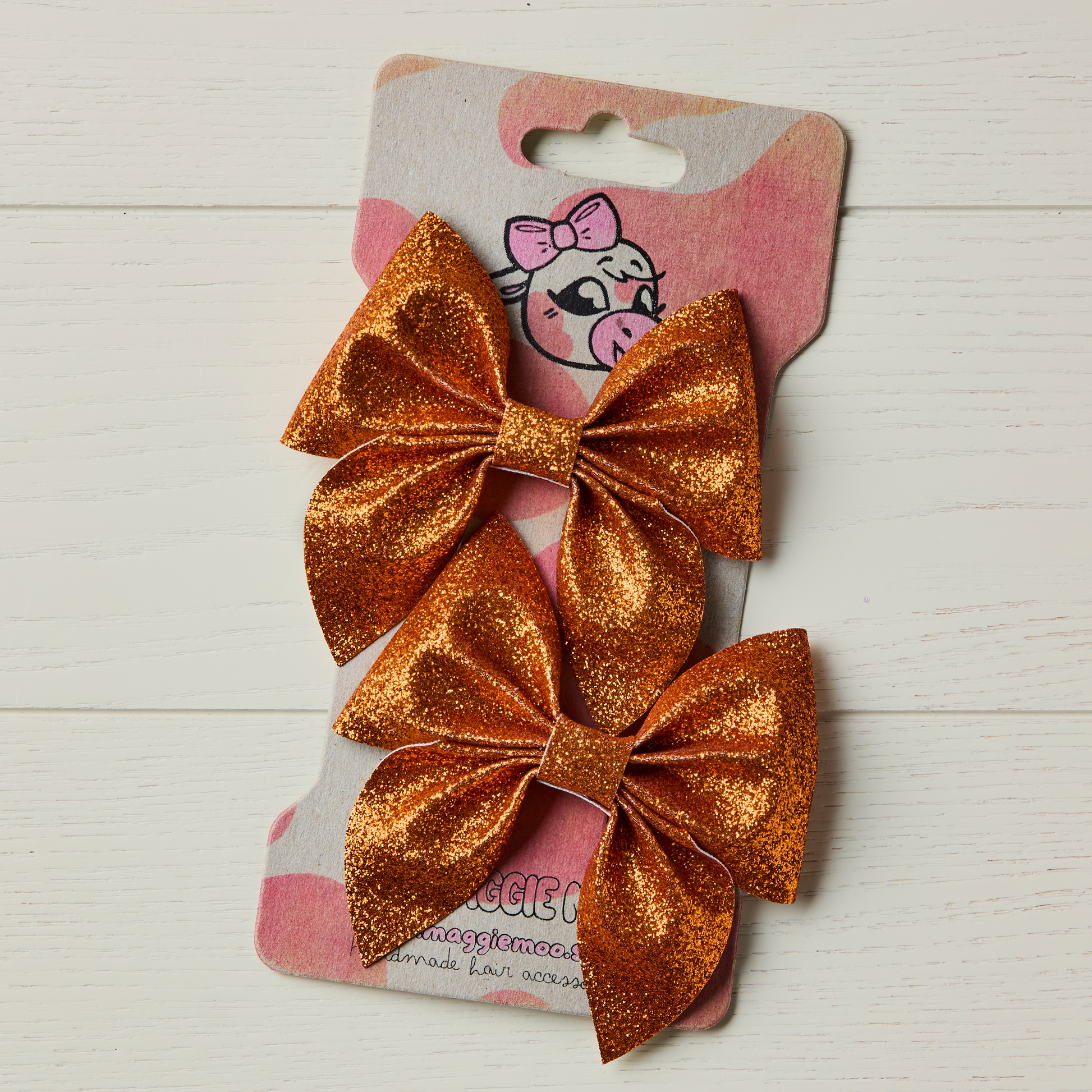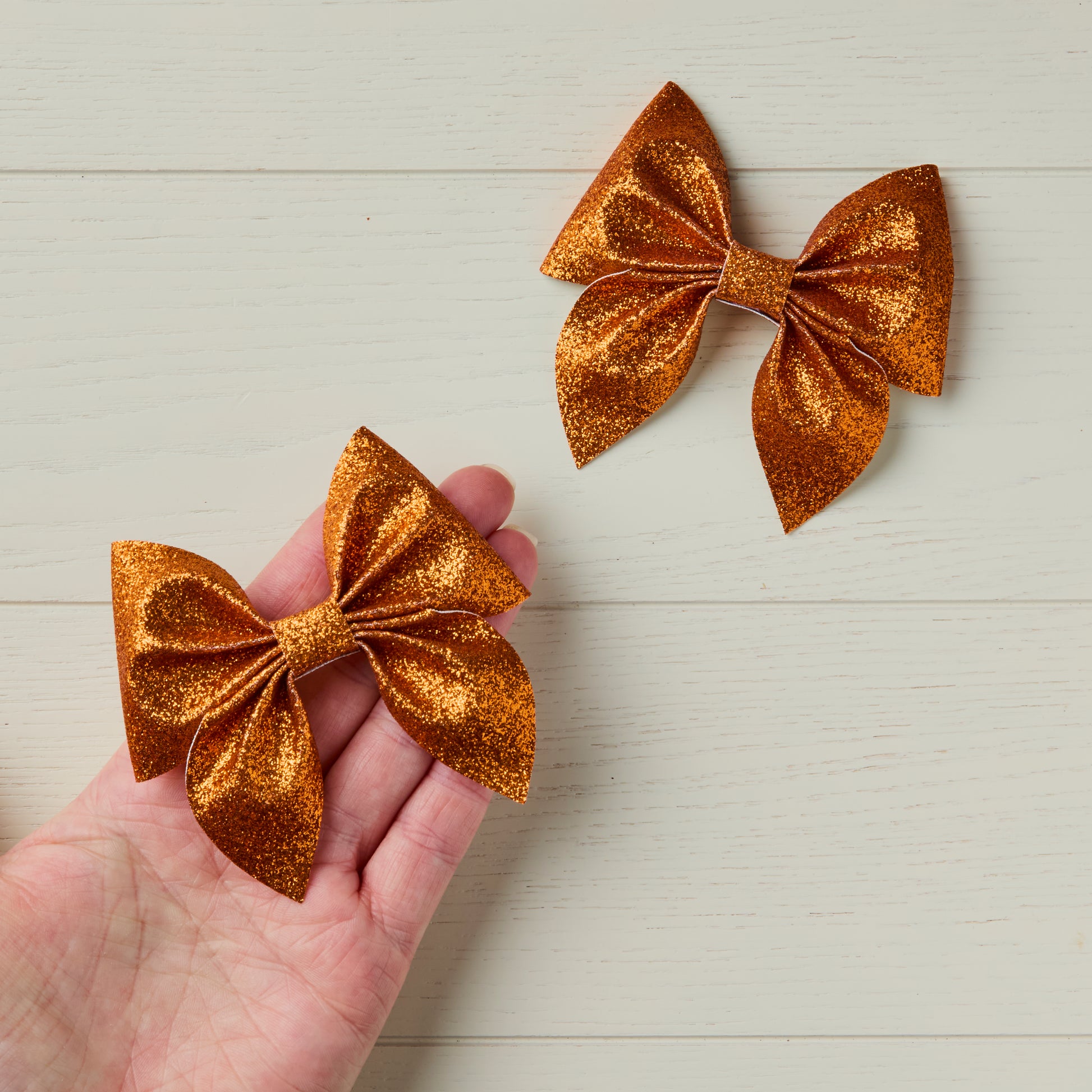 "Orange" you glad you found these sparkly orange hair bows? Handcrafted with fine glitter fabric, they sparkle like autumnal sunshine, perfect for the fall season, Halloween, Thanksgiving, or just because. Whether you're attending a dress up party or simply adding a pop of colour to your everyday outfit, these bows are a perfect addition.