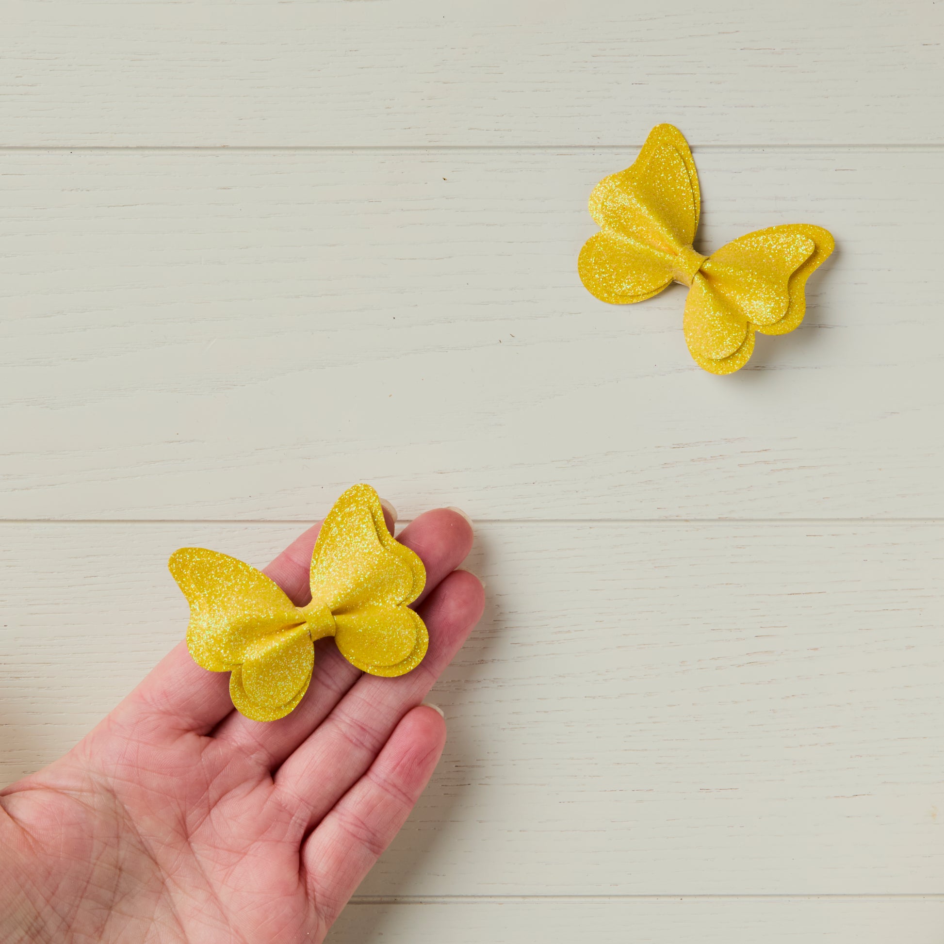 Bring a ray of sunshine to your day, regardless of the weather, with these cheerful yellow butterfly clips. Handcrafted with shimmering fine glitter fabric, they capture the joy of a warm spring day. These are perfect for adding a touch of happiness, optimism, and energy to any hairstyle.