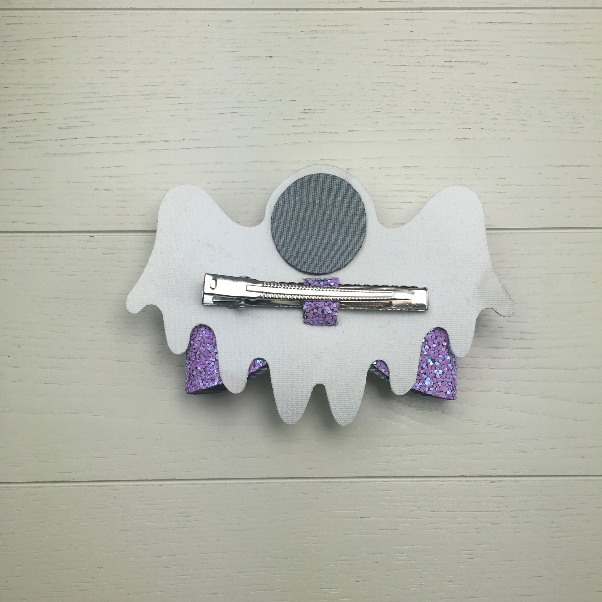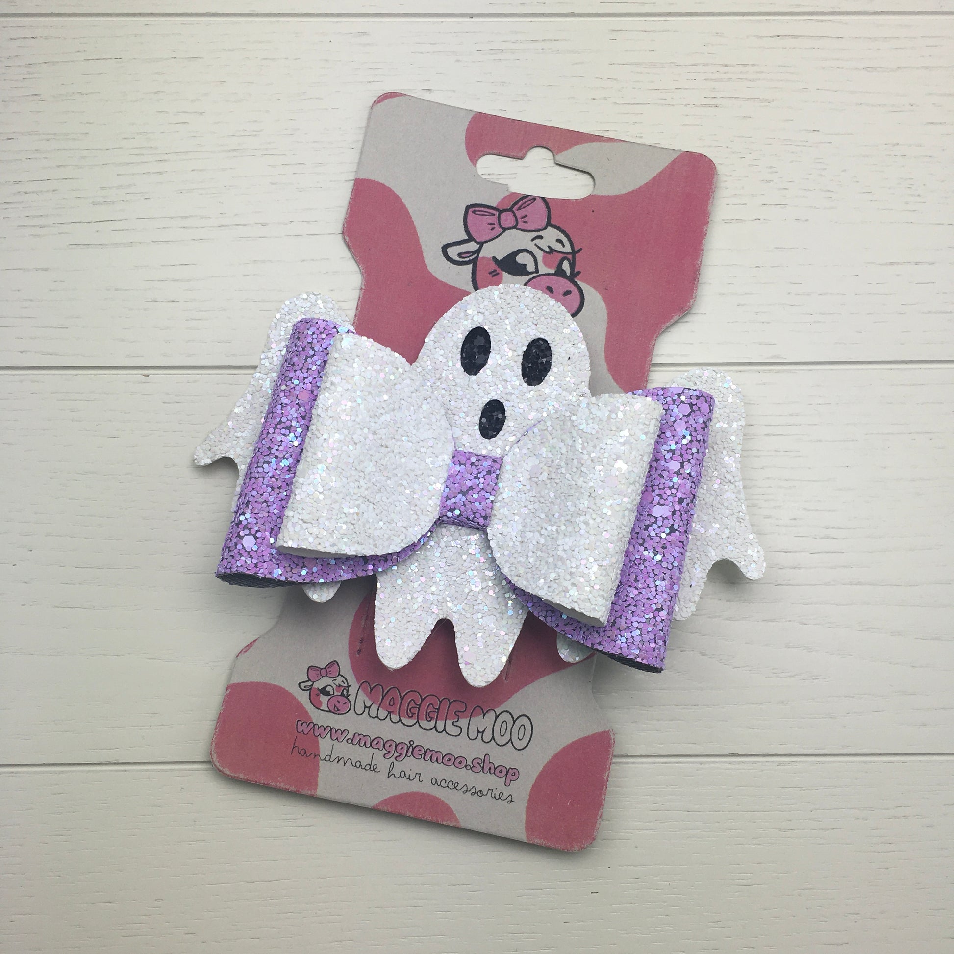 This large statement bow is hand crafted from ghostly white and sweet lilac confetti glitter fabric with a captivating texture and just the right amount of sparkle. It's the perfect accessory for anyone who wants to celebrate the season with a touch of spooky, but in soft, innocent and girly colours.Â