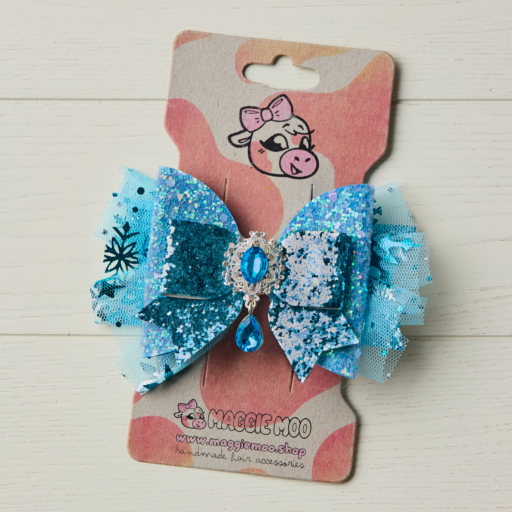 A wintery masterpiece, this icy blue hair bow features a delicate layer of snowflake tulle between sparkling glitter elements in two shades of blue as well as a faux gem centre.