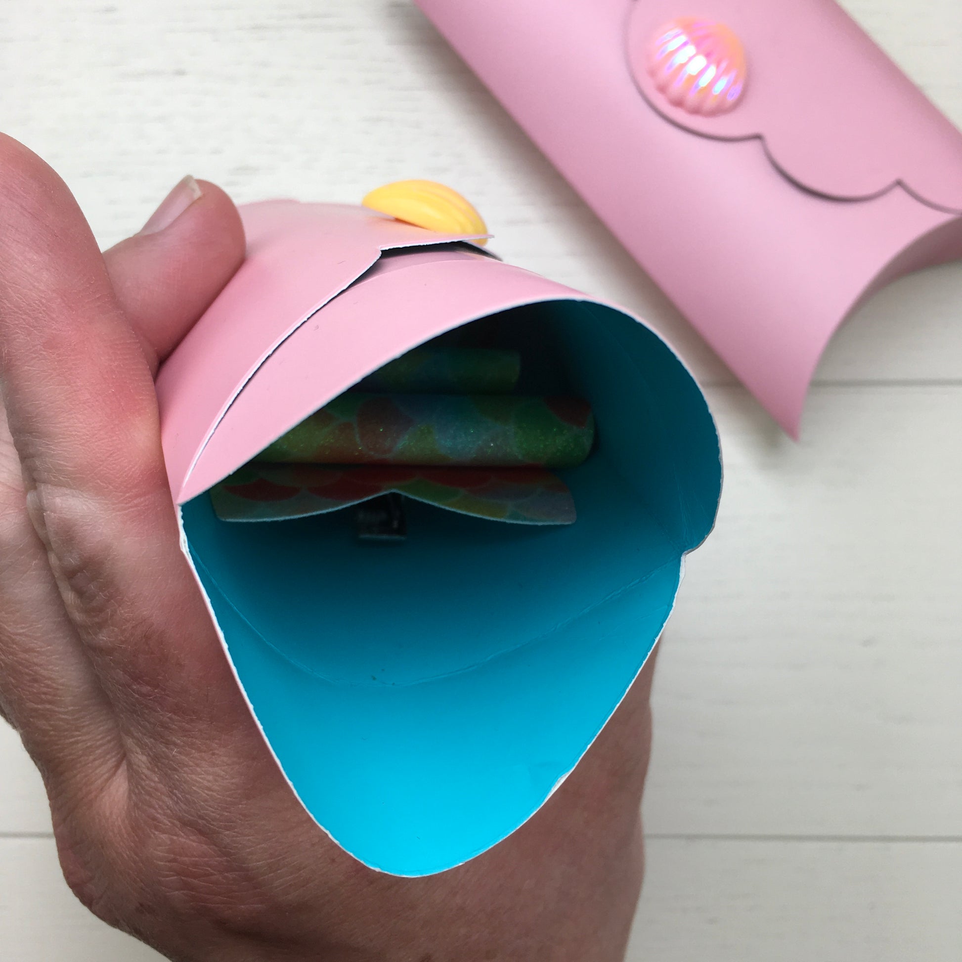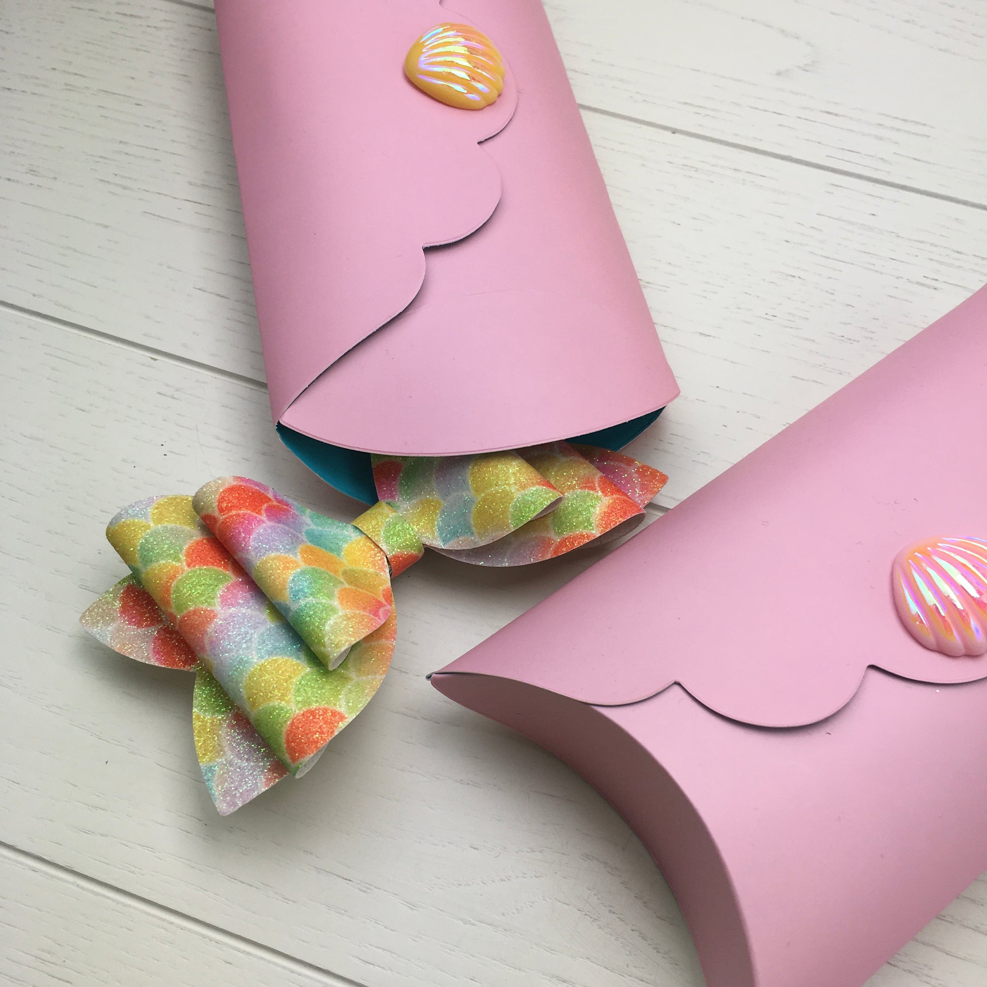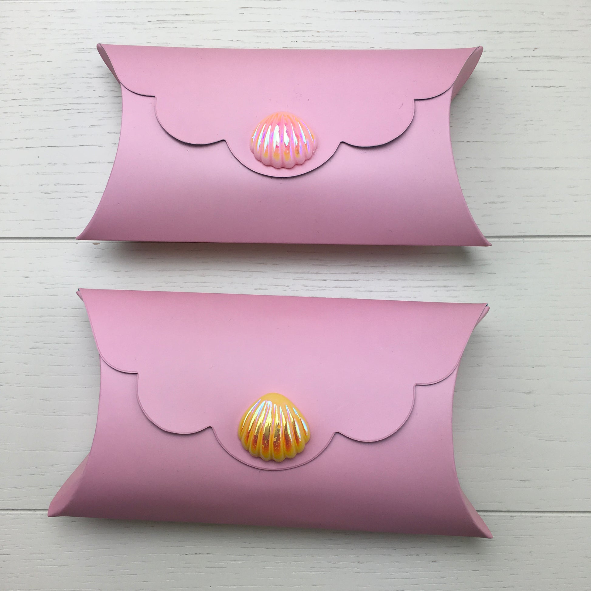 🎁 A special pillow pack, made from double sided coated paper — pink on the outside and blue on the inside. The pack is finished with a glistening AB resin shell embellishment (please note, the colour of the shell will vary).