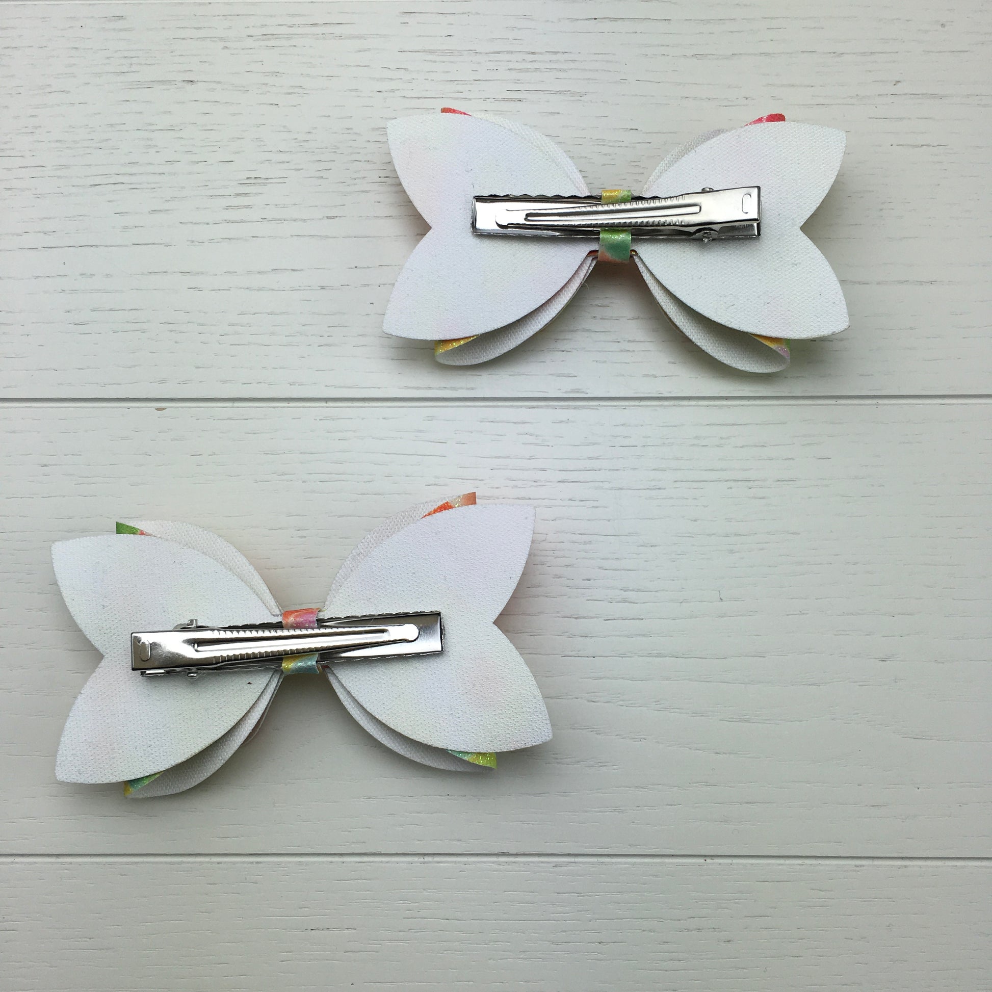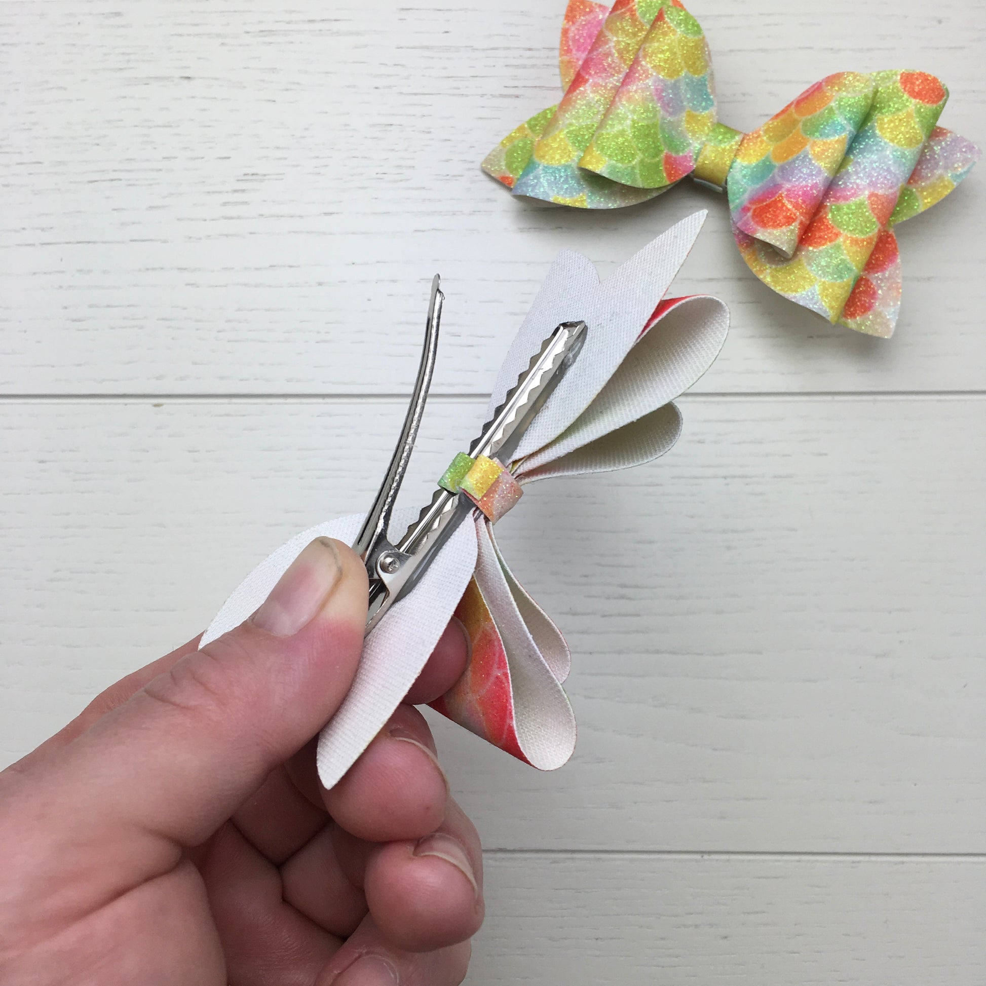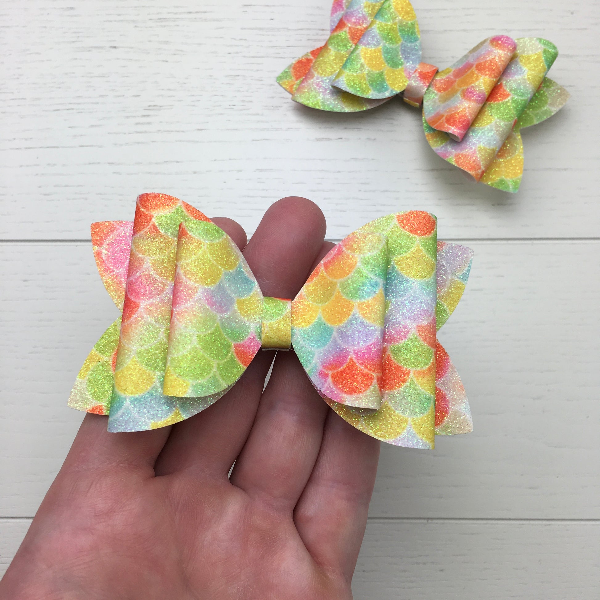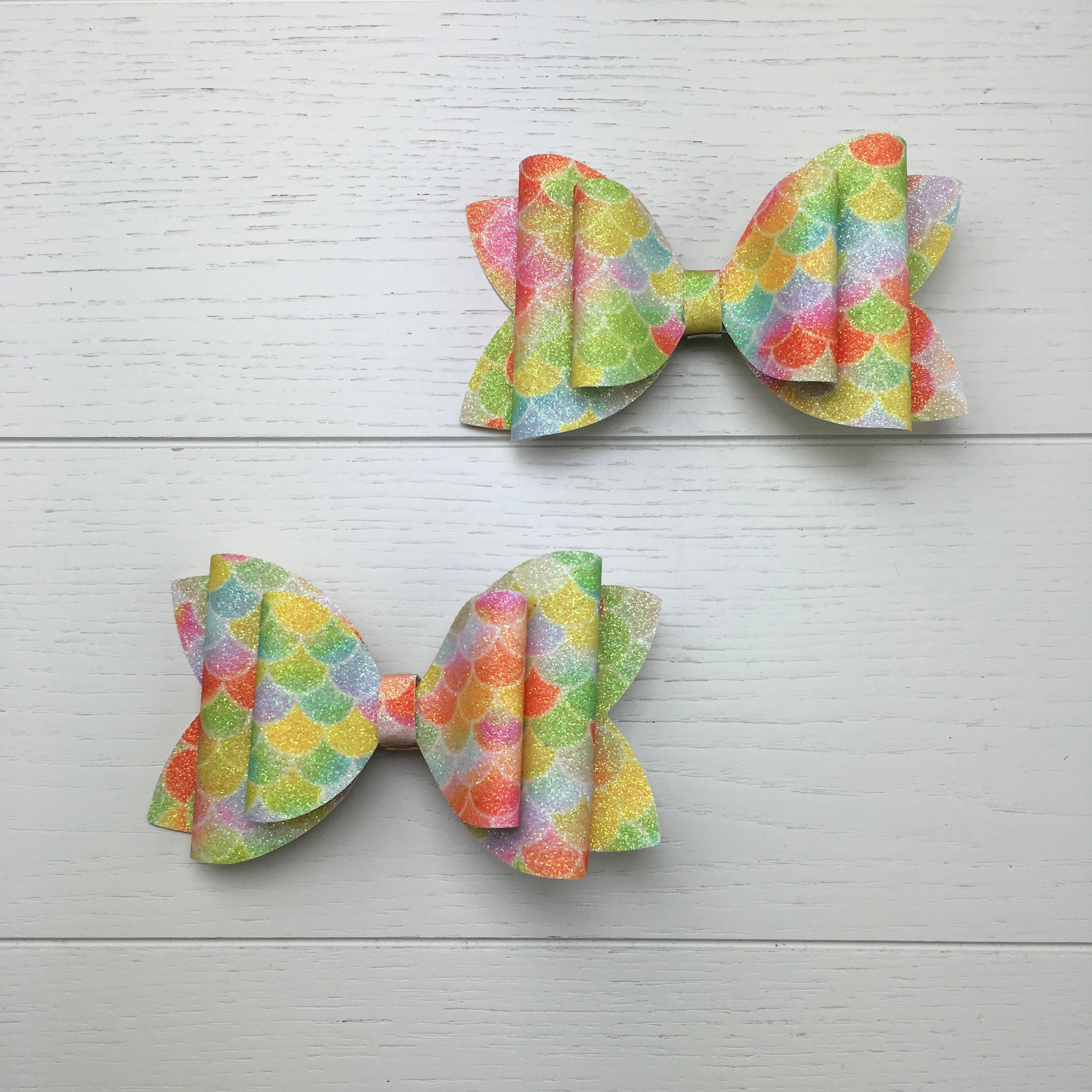 Each bow is set on a 55mm alligator clip. Due to the unique nature of the fish scale pattern, every bow will have a slightly different look in terms of colours and pattern placement, please see photos for representative examples.