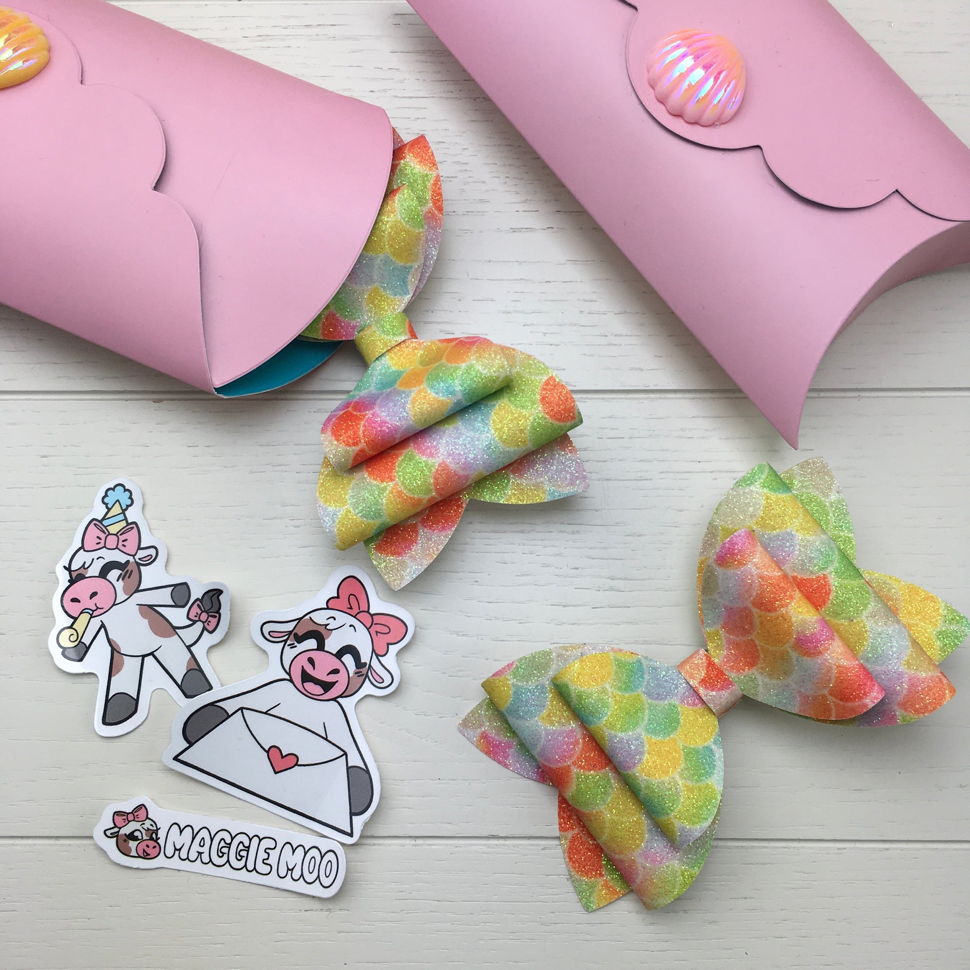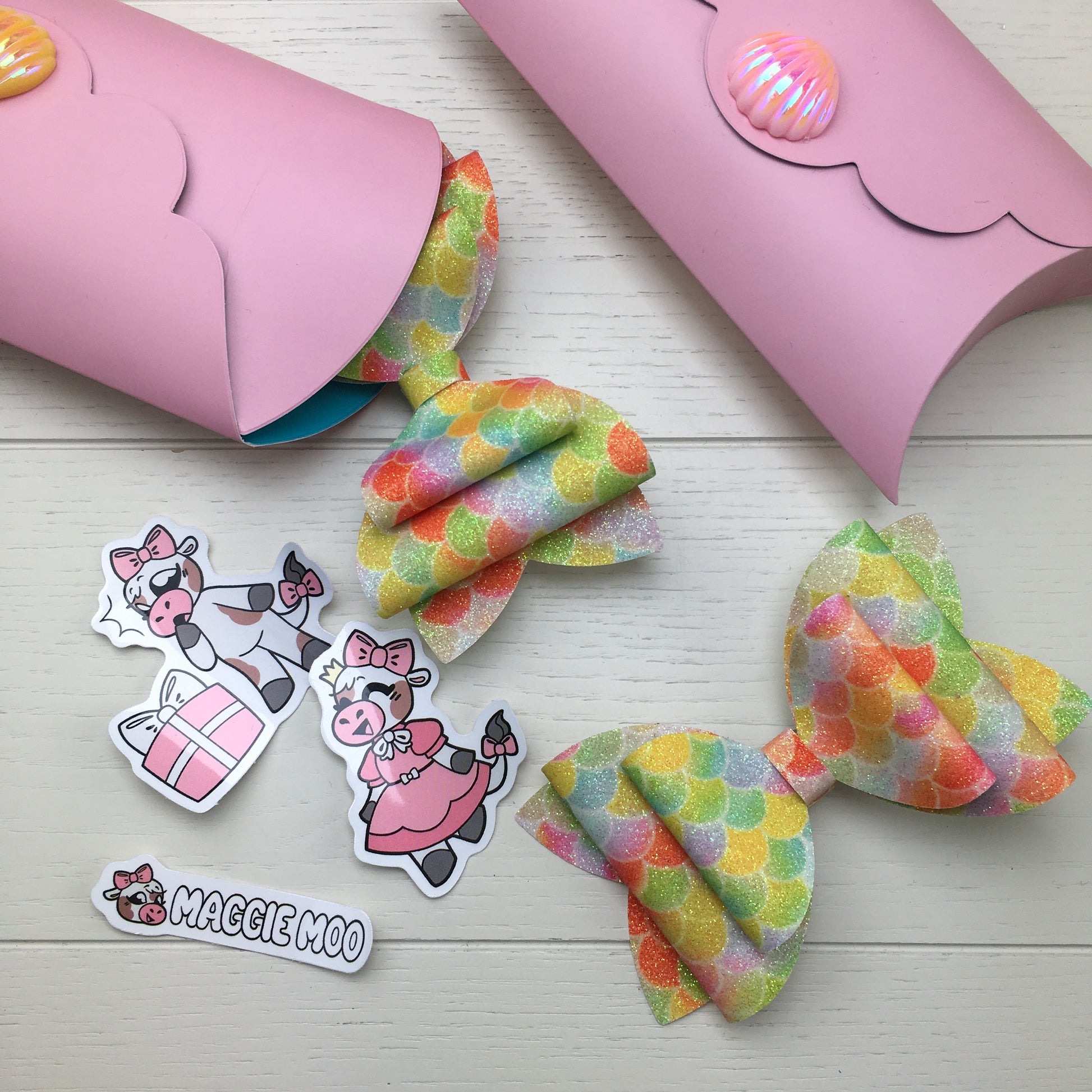 🎀 A double hair bow crafted from a shimmering fine glitter fabric featuring a rainbow mermaid scales print.